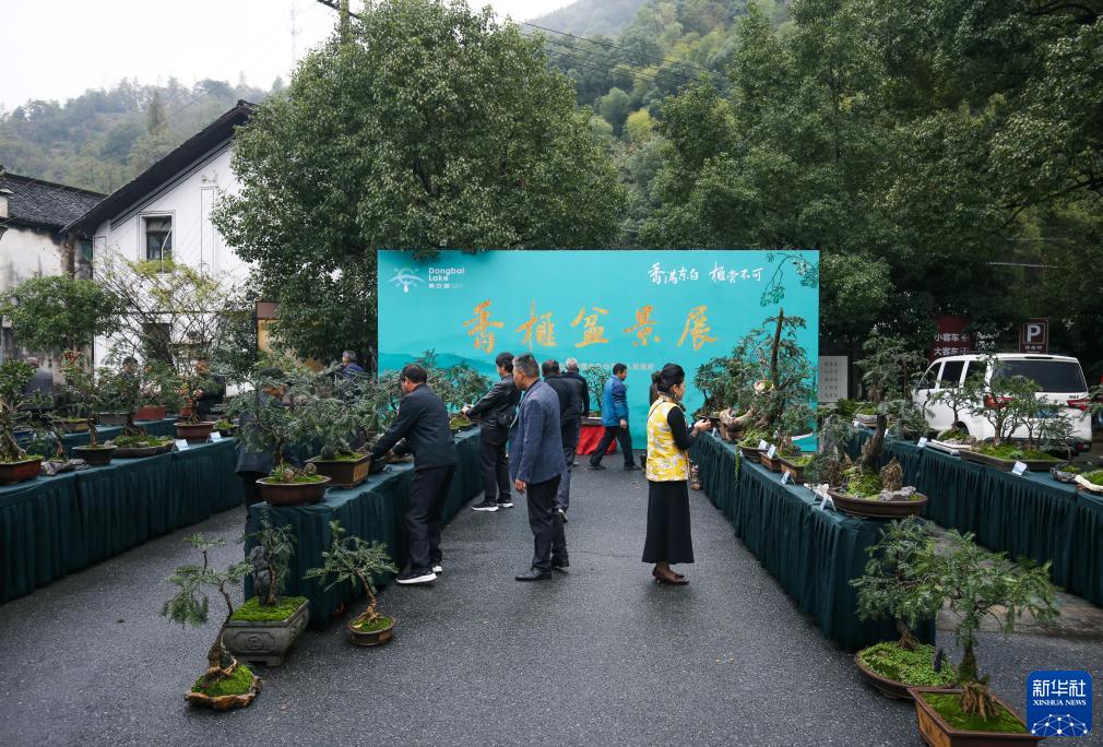 11月11日,在浙江省諸暨市東白湖鎮,香榧盆景愛(ài)好者、游客參觀(guān)香榧盆景展。