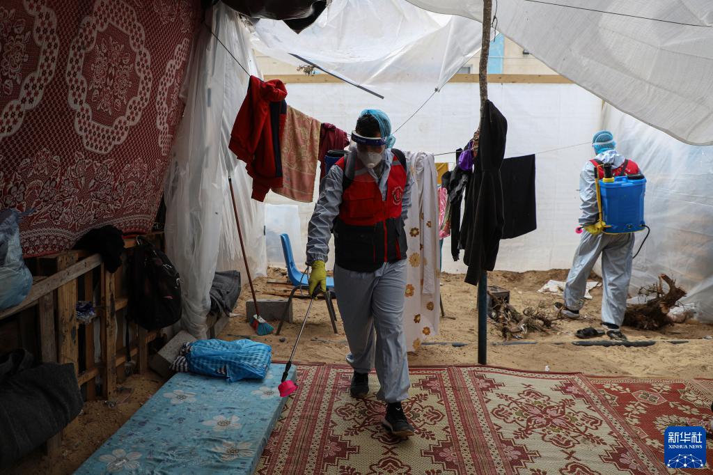 11月12日,工作人員在加沙地帶南部城市汗尤尼斯一處臨時(shí)難民營(yíng)噴灑消毒液。
