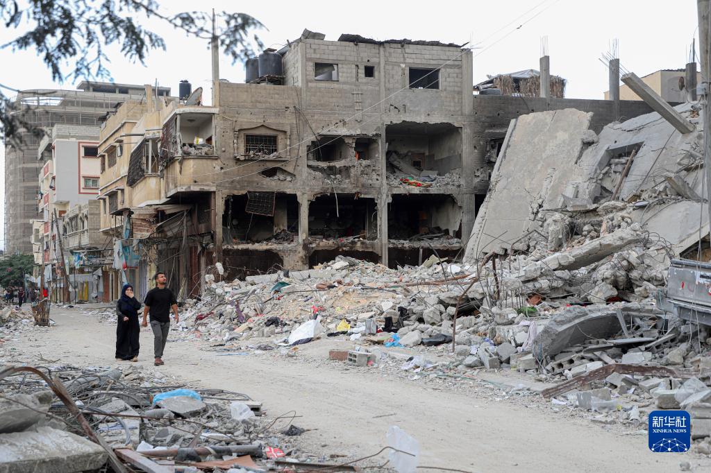 11月12日,行人經(jīng)過(guò)加沙地帶南部城市汗尤尼斯損毀的建筑。