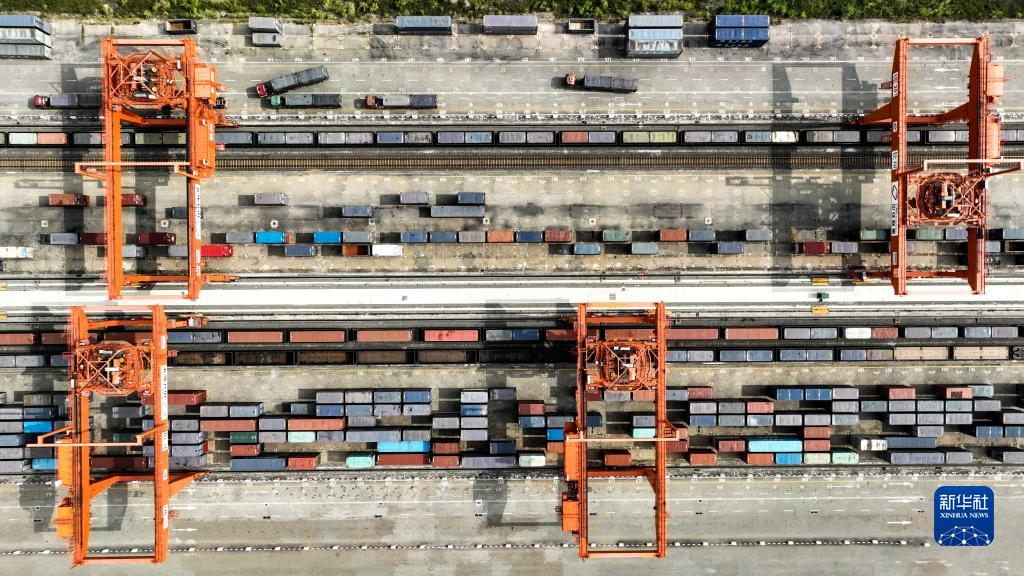 火車(chē)在欽州港碼頭裝運集裝箱(11月12日攝,無(wú)人機照片)。