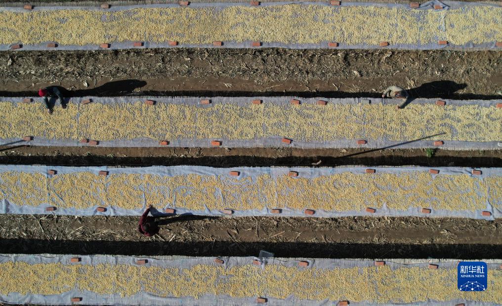 11月13日,秦皇島市昌黎縣團林鄉的扇貝養殖戶(hù)在晾曬收獲的扇貝柱(無(wú)人機照片)。