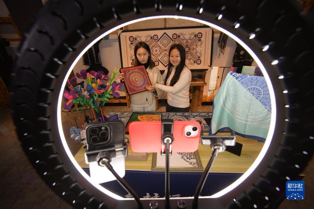 11月13日,工作人員在貴州省黔東南苗族侗族自治州施秉縣的一家苗繡企業(yè)直播銷(xiāo)售苗繡產(chǎn)品。