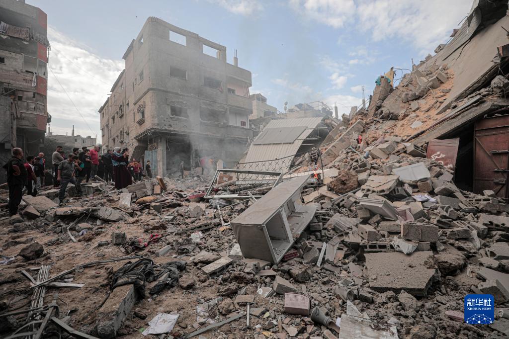 這是11月13日在加沙地帶中部地區拍攝的一個(gè)遭以色列空襲的建筑廢墟。