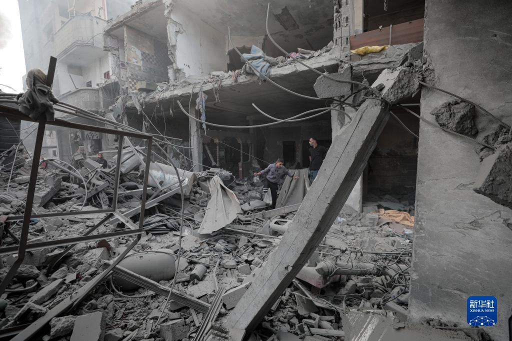 這是11月13日在加沙地帶中部地區拍攝的一個(gè)遭以色列空襲的建筑廢墟。