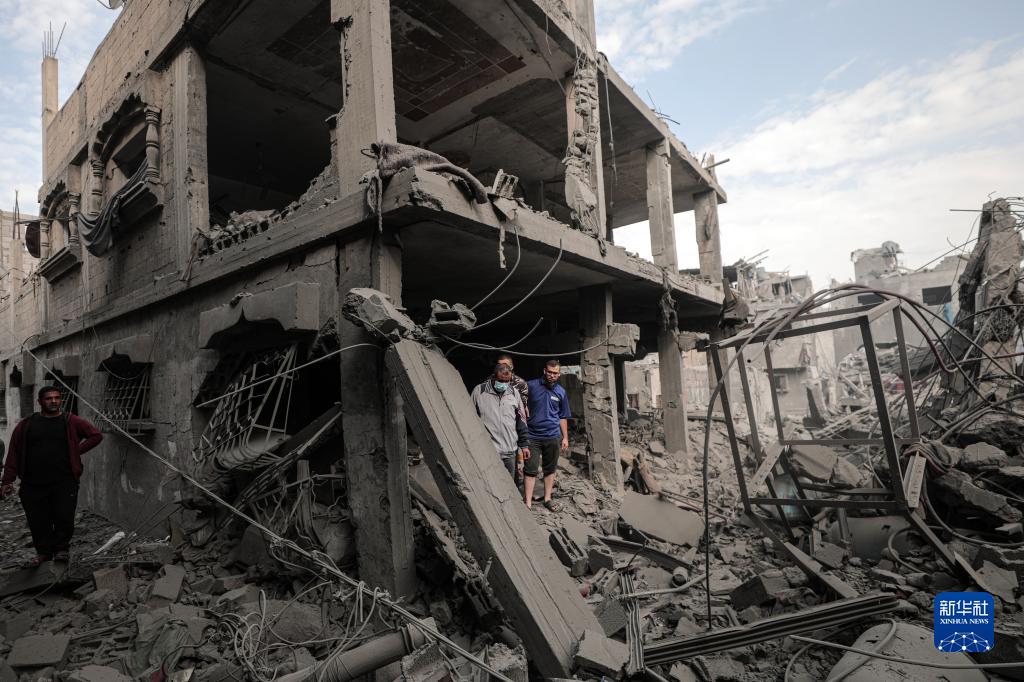 這是11月13日在加沙地帶中部地區拍攝的一個(gè)遭以色列空襲的建筑廢墟。