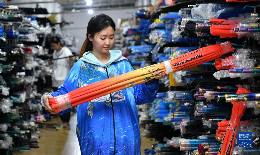 11月14日,河北省肅寧縣一家魚(yú)竿漁具生產(chǎn)企業(yè)的工人在倉庫內整理產(chǎn)品。