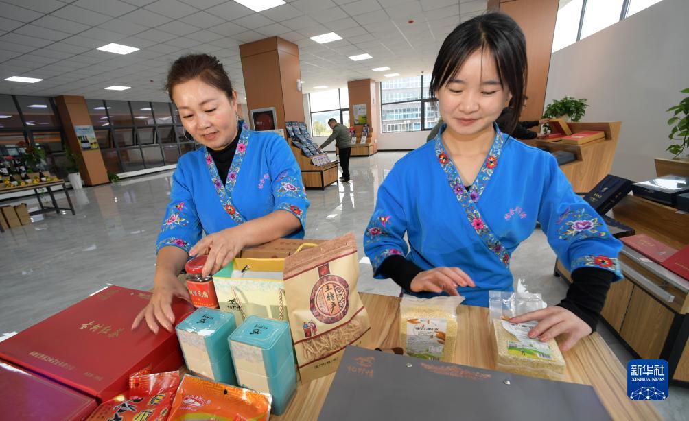 11月14日,在施秉縣產(chǎn)業(yè)園區一家電商企業(yè)的展廳,直播平臺的工作人員在整理農產(chǎn)品。