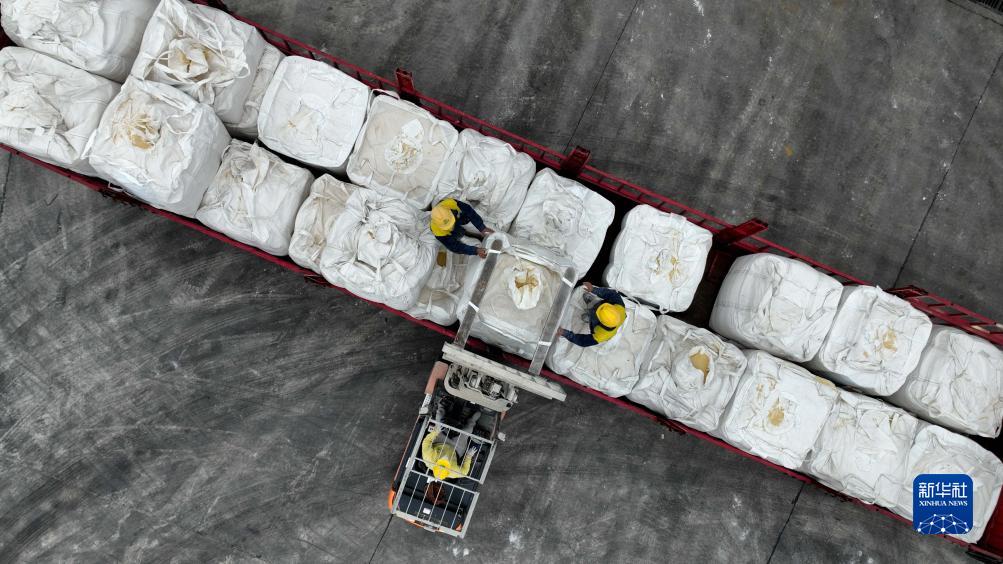 11月14日,工人在施秉縣一家飼料生產(chǎn)企業(yè)內搬運飼料(無(wú)人機照片)。