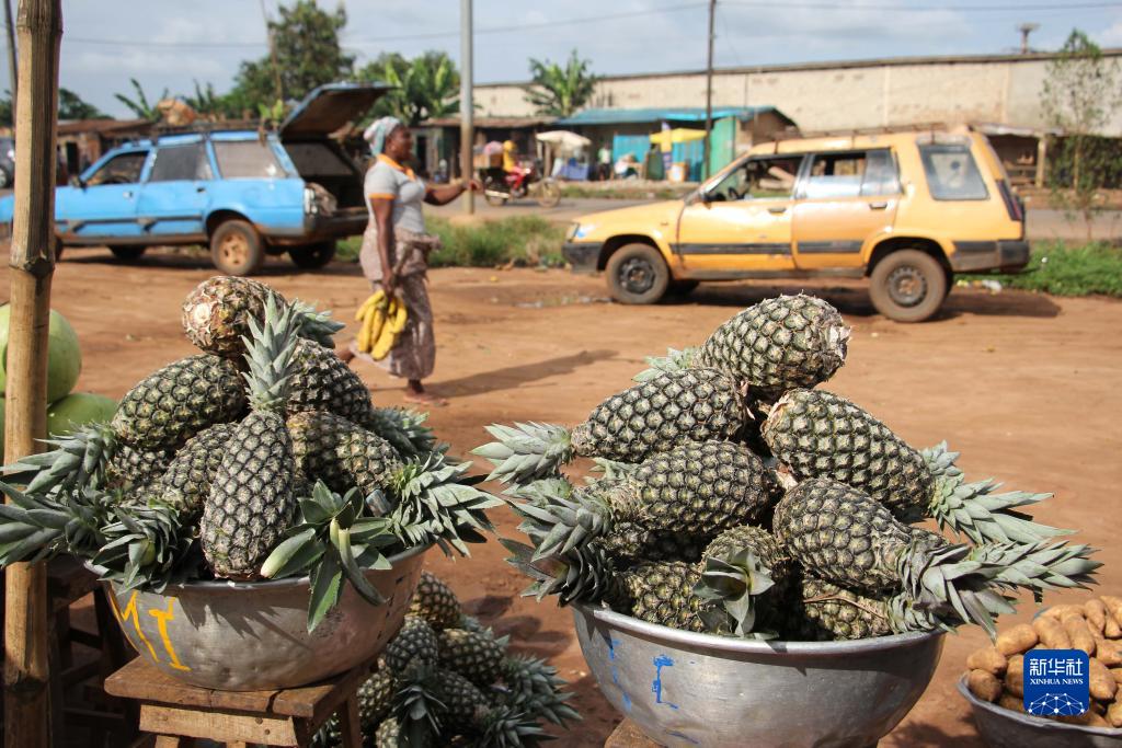 這是在貝寧“甜面包”菠蘿主產(chǎn)區澤鎮一家水果攤拍攝的菠蘿(2023年10月23日攝)?!疤鹈姘辈ぬ}是貝寧首個(gè)獲得非洲知識產(chǎn)權組織認證的地理標志產(chǎn)品。近日,在第六屆中國國際進(jìn)口博覽會(huì )上,空運來(lái)華的1000公斤貝寧“甜面包”菠蘿首次與中國公眾見(jiàn)面。