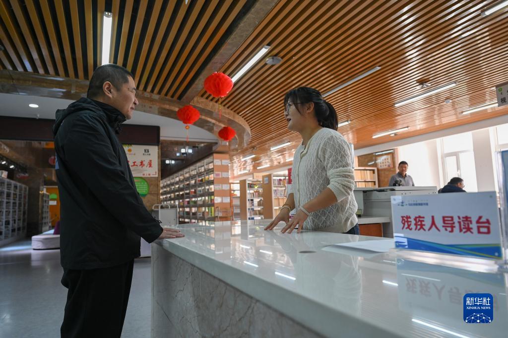 11月14日,在內蒙古烏拉特前旗圖書(shū)館視障閱覽室內,一名視障人士(左)在咨詢(xún)工作人員。