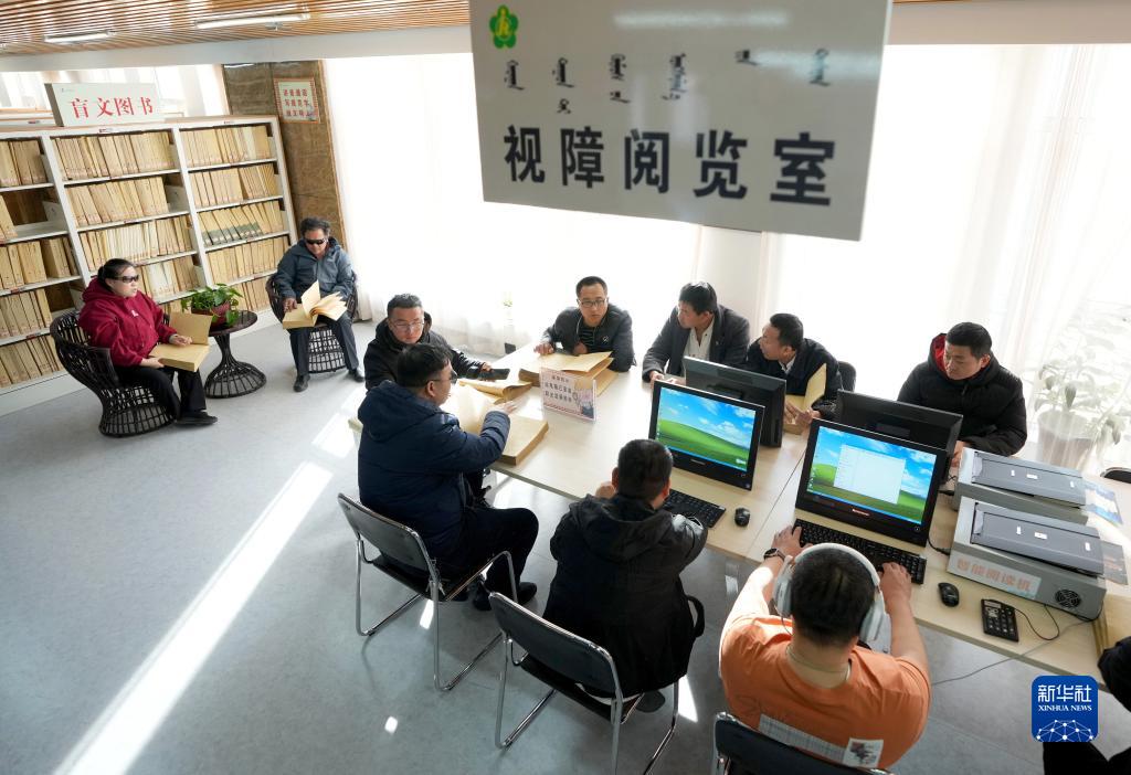 指尖滑過(guò)盲文、耳機傾聽(tīng)讀物,內蒙古巴彥淖爾市烏拉特前旗圖書(shū)館視障閱覽室內視障人士可以無(wú)礙“閱讀”書(shū)籍。