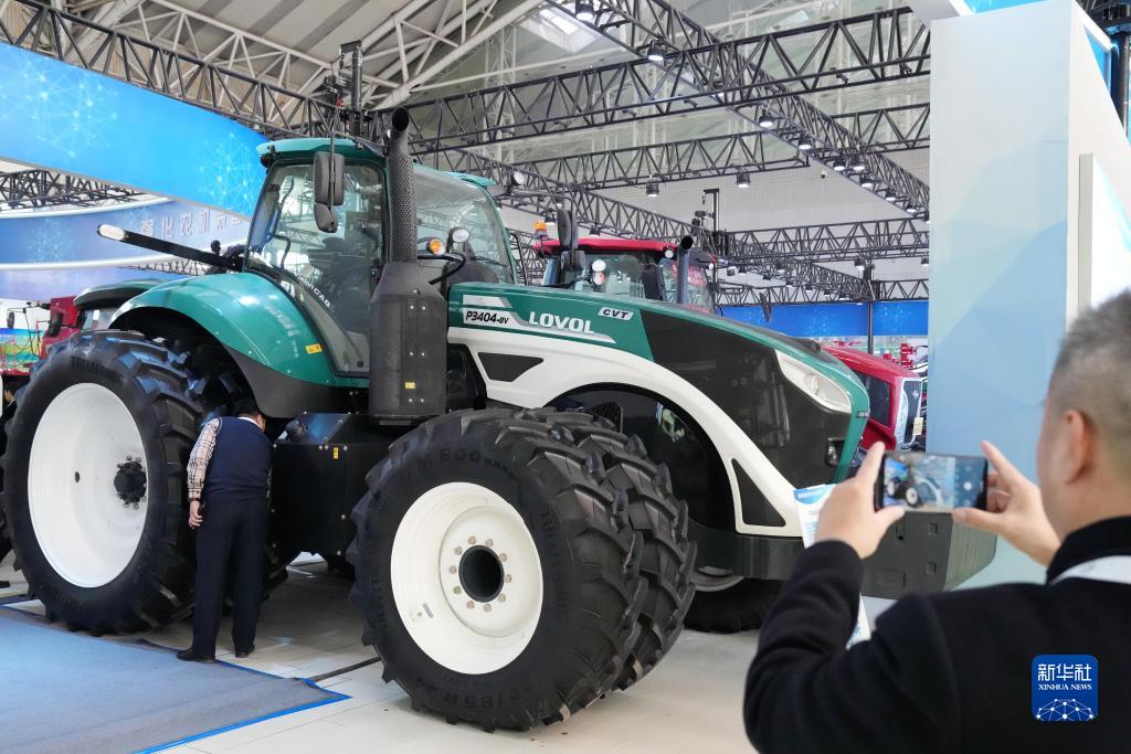11月15日,在首屆中國(黑龍江)國際綠色食品和全國大豆產(chǎn)業(yè)博覽會(huì )大豆農機裝備展區,參會(huì )者拍攝一款農機。