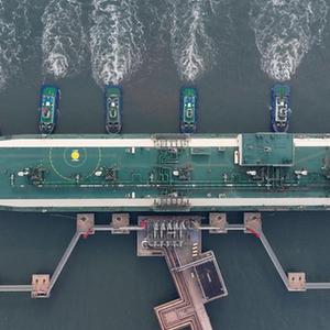 11月15日,來(lái)自卡塔爾的“阿爾達夫那”號LNG輪在拖輪的協(xié)助下向唐山港曹妃甸港區中國石油唐山LNG接收站碼頭靠泊(無(wú)人機照片)。