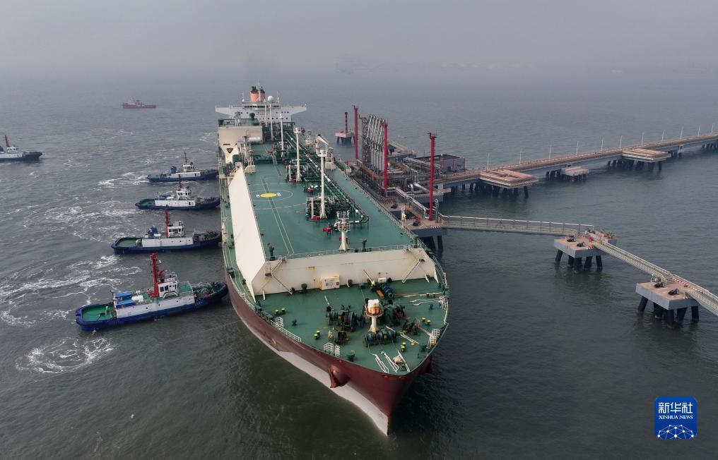 11月15日,來(lái)自卡塔爾的“阿爾達夫那”號LNG輪在拖輪的協(xié)助下向唐山港曹妃甸港區中國石油唐山LNG接收站碼頭靠泊(無(wú)人機照片)。