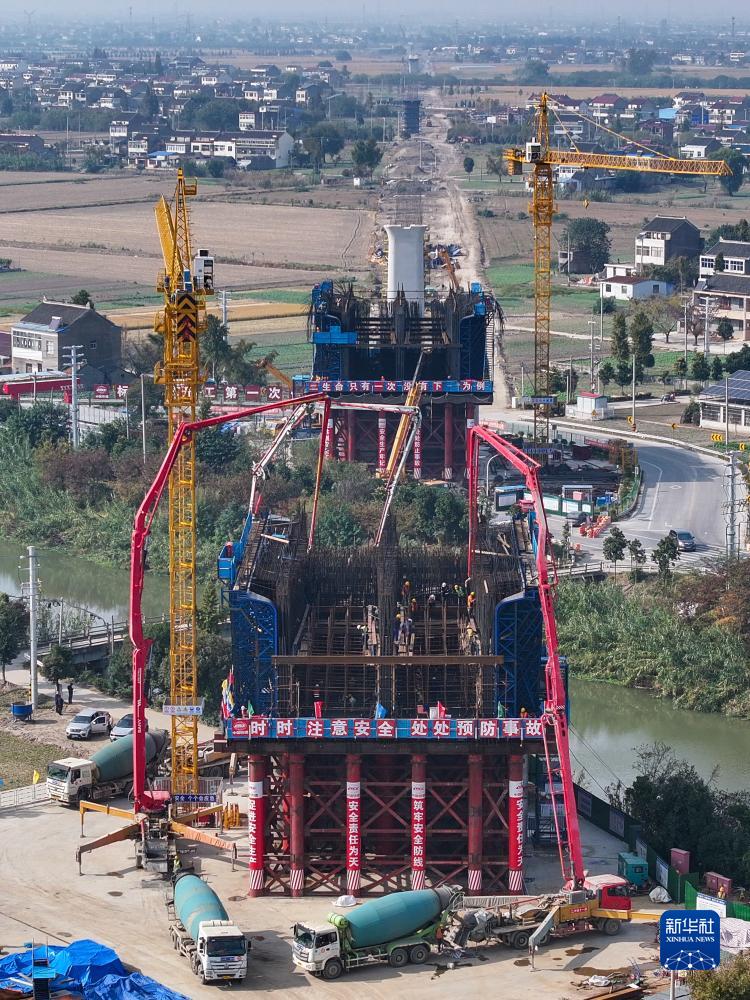 這是11月15日拍攝的滬渝蓉高鐵泰州段通泰揚特大橋跨如泰運河及X355縣道連續梁拱施工現場(chǎng)(無(wú)人機照片)。