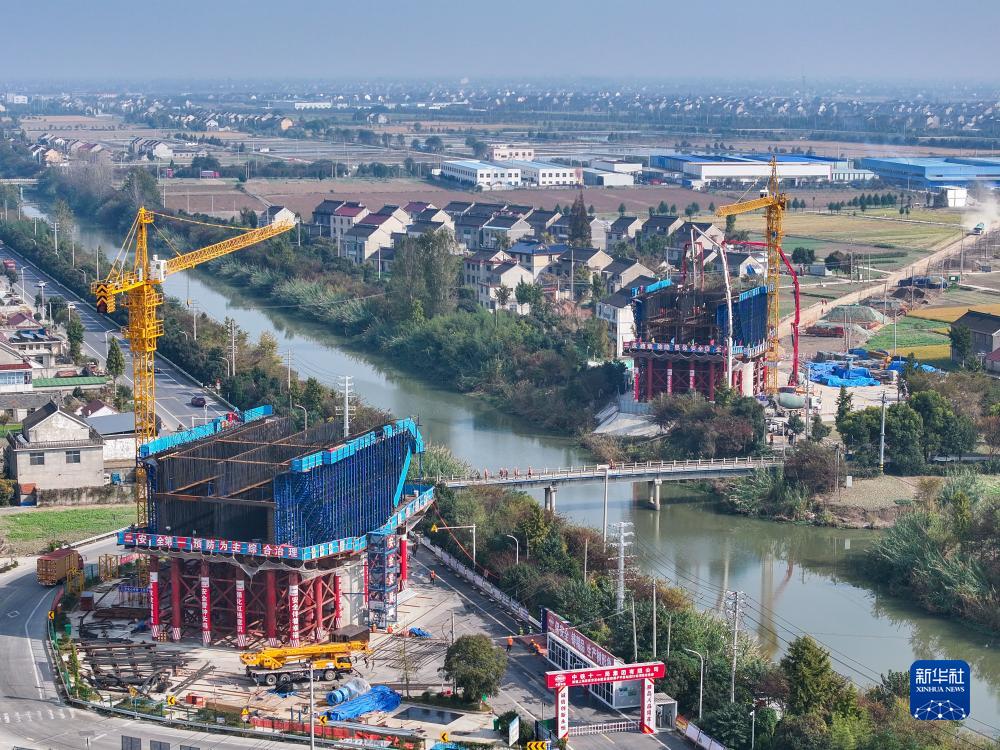 這是11月15日拍攝的滬渝蓉高鐵泰州段通泰揚特大橋跨如泰運河及X355縣道連續梁拱施工現場(chǎng)(無(wú)人機照片)。