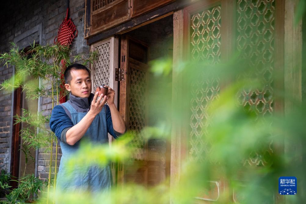 11月14日,管永雙在西山雨陶藝工作室把玩陶藝作品。