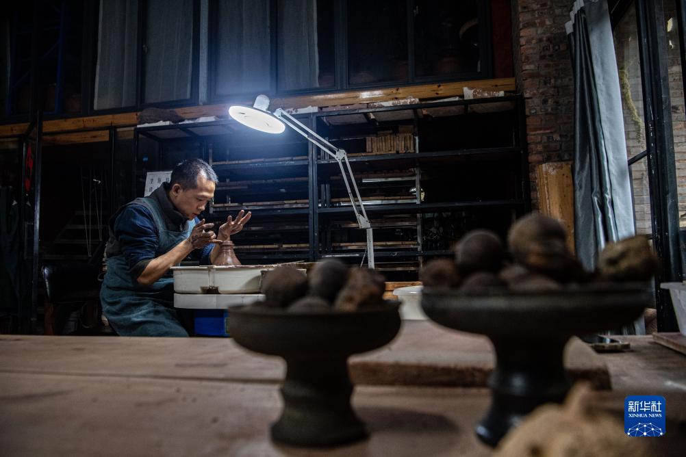 11月14日,管永雙在西山雨陶藝工作室內進(jìn)行陶藝制作。