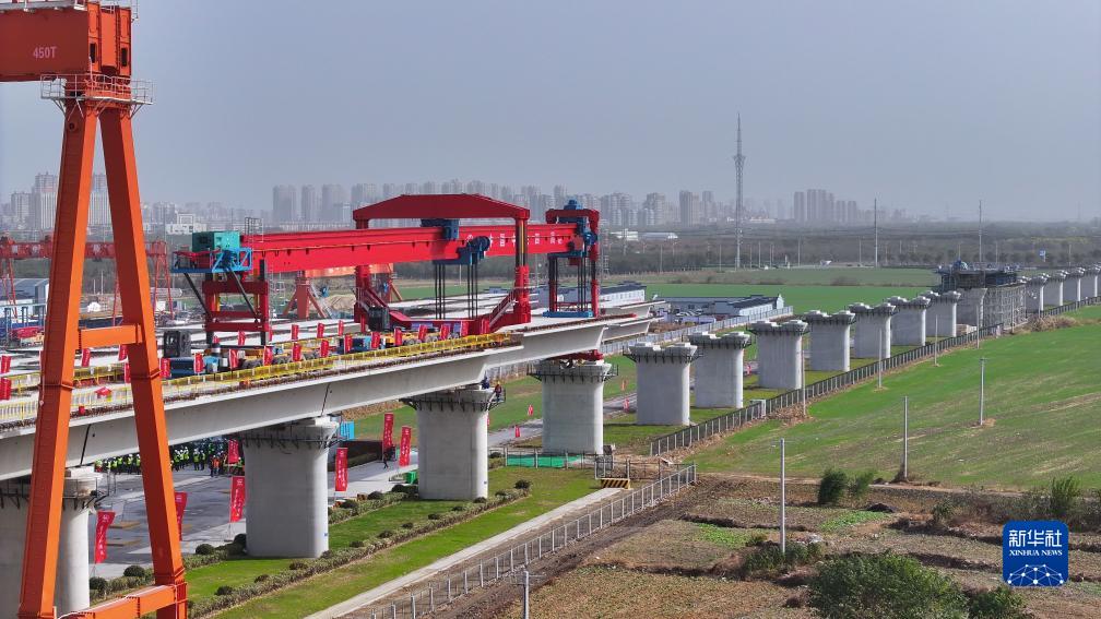 這是中鐵四局阜淮鐵路全線(xiàn)首榀箱梁架設現場(chǎng)(11月16日,無(wú)人機照片)。