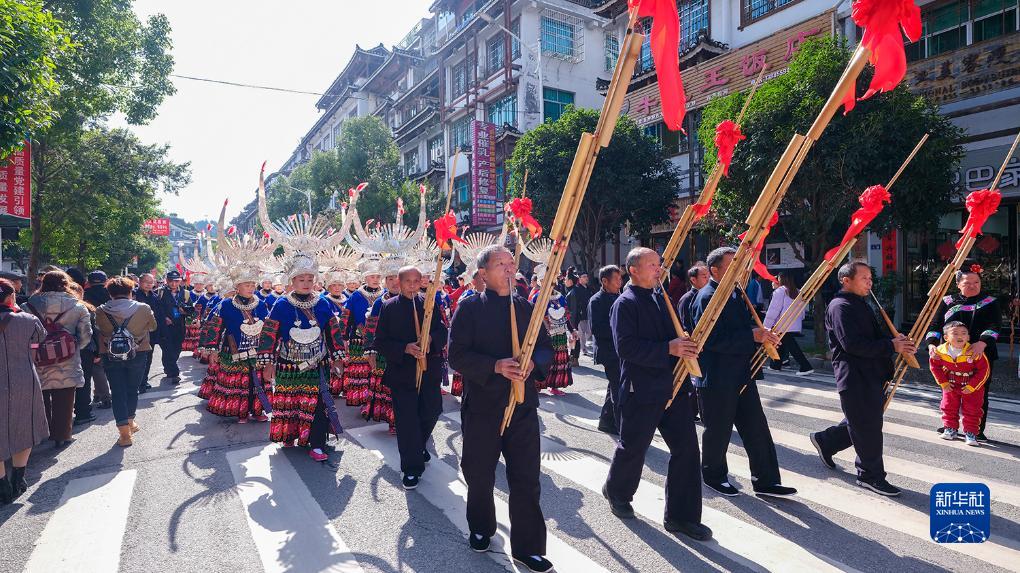 當日,貴州省黔東南苗族侗族自治州雷山縣迎來(lái)苗族同胞的傳統節日苗年。今年苗年又恰逢十三年一次的鼓藏節,歡樂(lè )氣氛格外濃烈。來(lái)自縣內外的數萬(wàn)名苗族群眾歡聚雷山縣城,通過(guò)盛裝巡游、非遺展示、千人長(cháng)桌宴等形式歡度節日。苗年和鼓藏節均為國家級非物質(zhì)文化遺產(chǎn)。