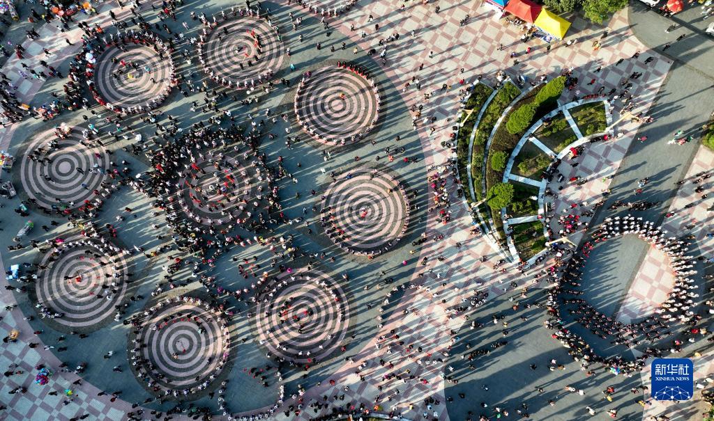 11月16日,在雷山縣民族文化活動(dòng)中心,苗族同胞身著(zhù)盛裝,載歌載舞歡慶苗年和鼓藏節(無(wú)人機照片)。