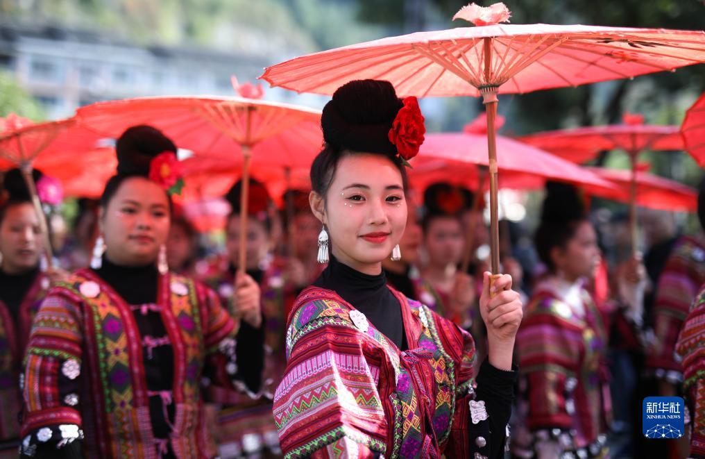 當日,貴州省黔東南苗族侗族自治州雷山縣迎來(lái)苗族同胞的傳統節日苗年。今年苗年又恰逢十三年一次的鼓藏節,歡樂(lè )氣氛格外濃烈。來(lái)自縣內外的數萬(wàn)名苗族群眾歡聚雷山縣城,通過(guò)盛裝巡游、非遺展示、千人長(cháng)桌宴等形式歡度節日。苗年和鼓藏節均為國家級非物質(zhì)文化遺產(chǎn)。