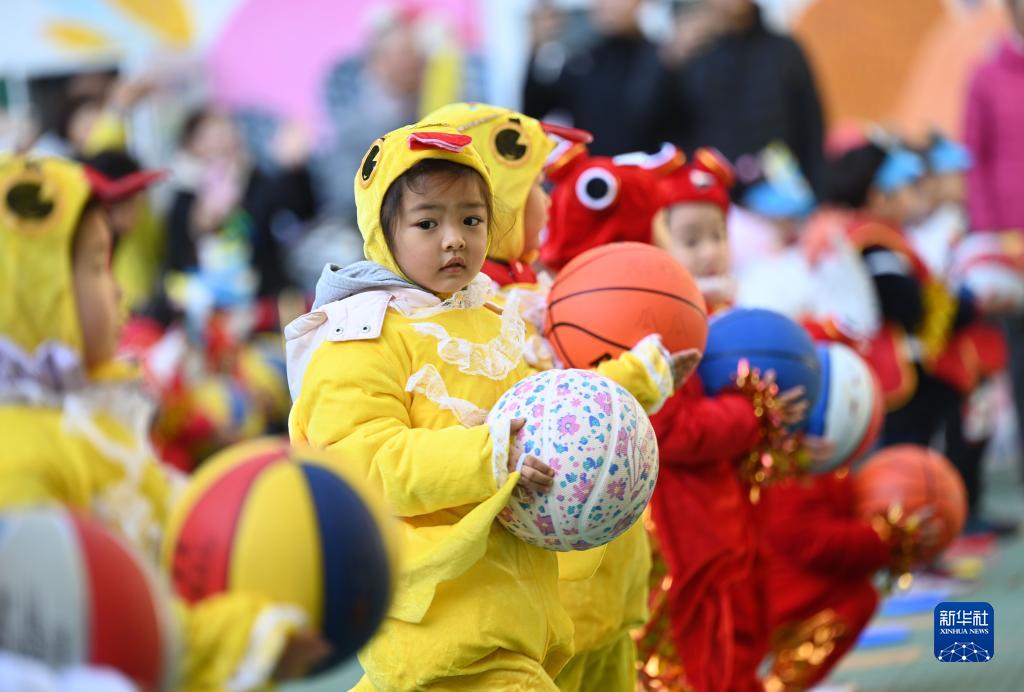 11月17日,幼兒在親子運動(dòng)會(huì )上準備拍皮球。