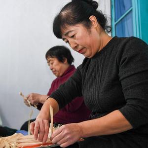11月16日,在長(cháng)春市九臺區龍嘉巧姐草編農民專(zhuān)業(yè)合作社,閆金鳳(右)帶領(lǐng)社員制作草編工藝品。