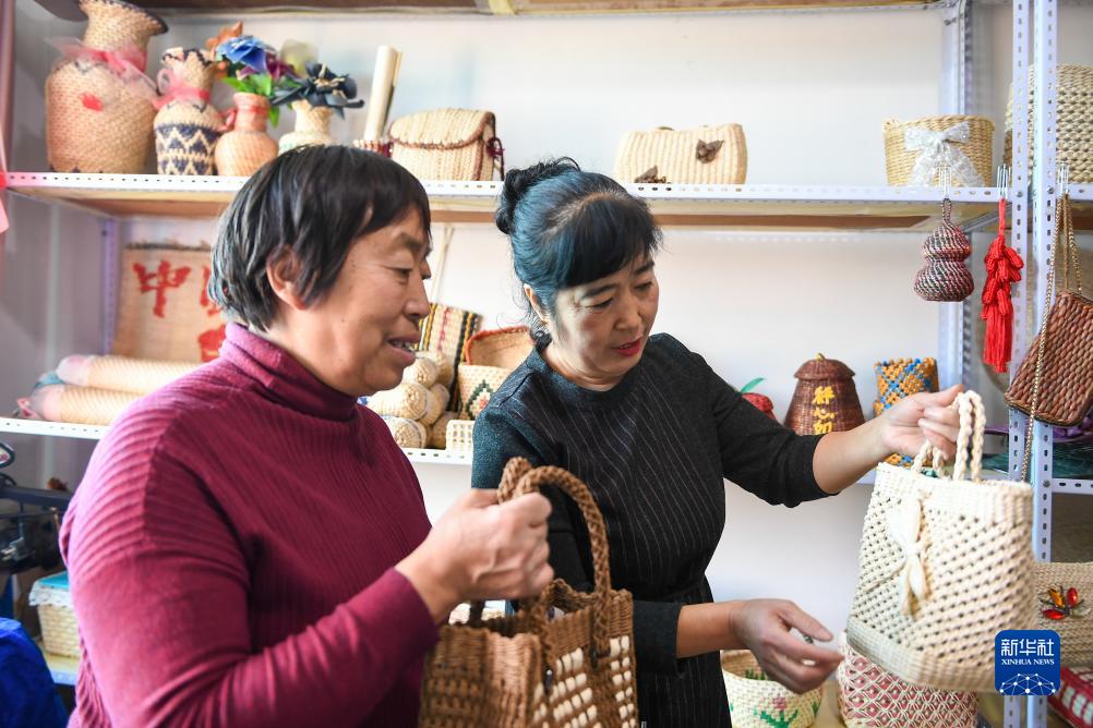 11月16日,在長(cháng)春市九臺區龍嘉巧姐草編農民專(zhuān)業(yè)合作社,閆金鳳(右)向社員展示草編工藝品。