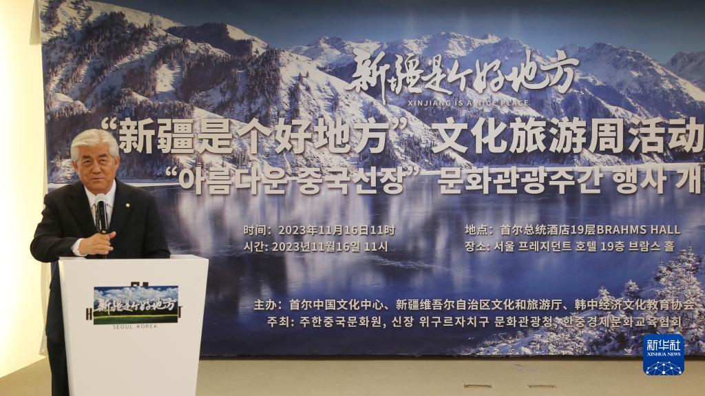 11月16日,韓國國會(huì )文化體育觀(guān)光委員會(huì )委員長(cháng)、國會(huì )議員李相憲在“新疆是個(gè)好地方”文化旅游周活動(dòng)開(kāi)幕式上致辭。