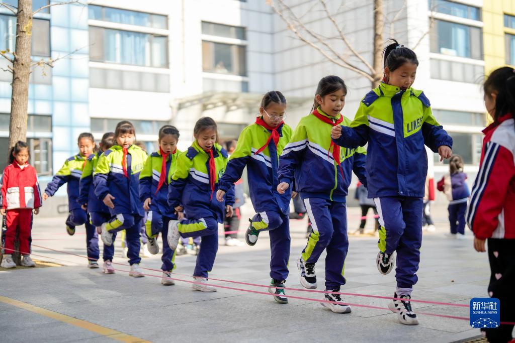 11月17日,河北省唐山市路北區橡樹(shù)灣小學(xué)學(xué)生利用課間時(shí)間跳皮筋。