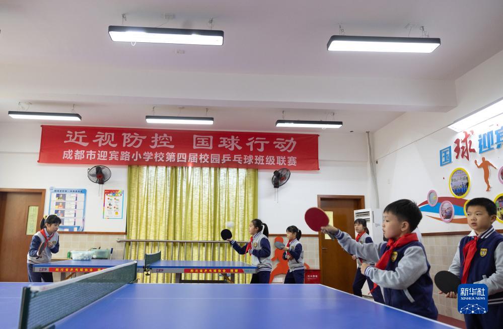 11月17日,在成都市迎賓路小學(xué)健康空間,學(xué)生利用課余時(shí)間打乒乓球。