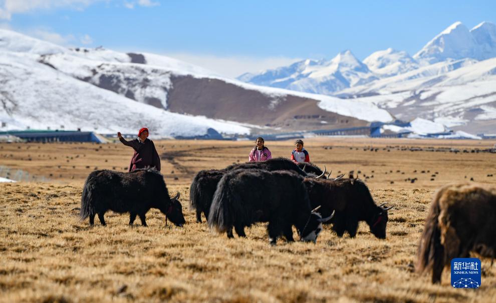 斯曲卓瑪(中)和爸爸、妹妹一起在草原上放牧(11月15日攝)。