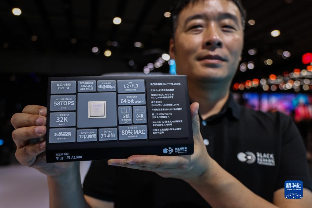 11月17日,黑芝麻智能的工作人員在廣州車(chē)展展示一款車(chē)規級自動(dòng)駕駛芯片。