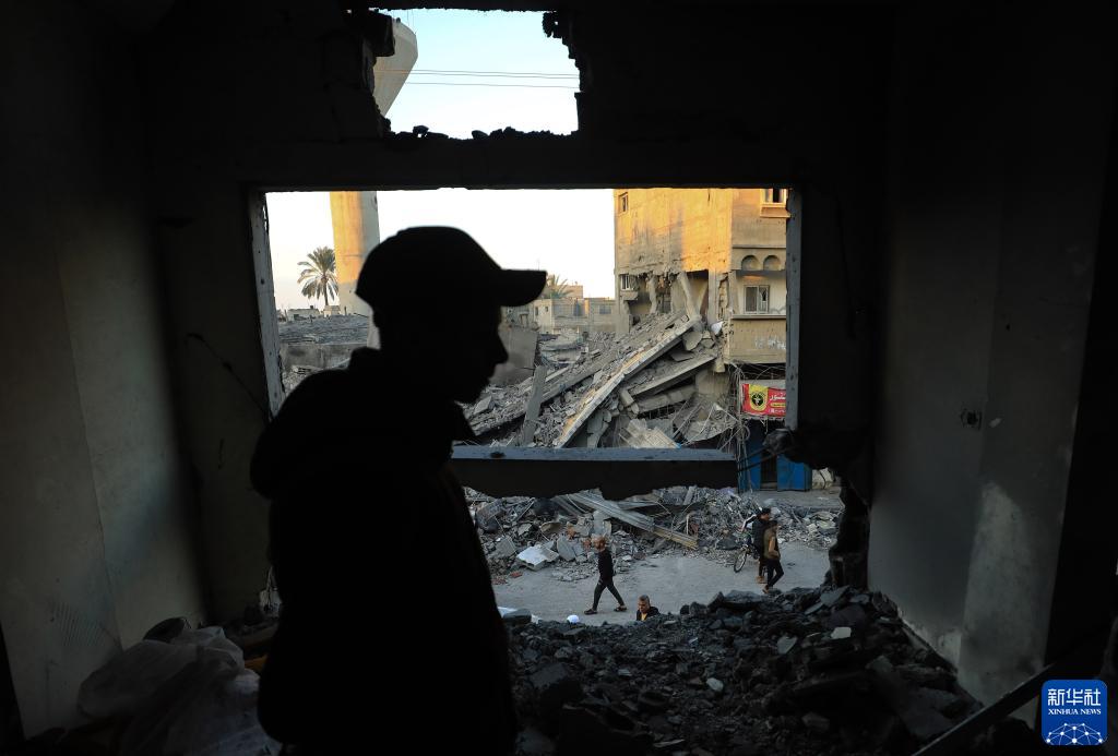 11月17日,在加沙地帶南部城市汗尤尼斯,一名男子查看遭以色列襲擊后的建筑廢墟。