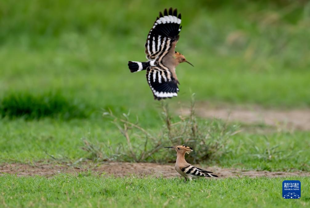 兩只戴勝鳥(niǎo)在福州長(cháng)樂(lè )閩江河口濕地打鬧嬉戲(11月15日攝)。