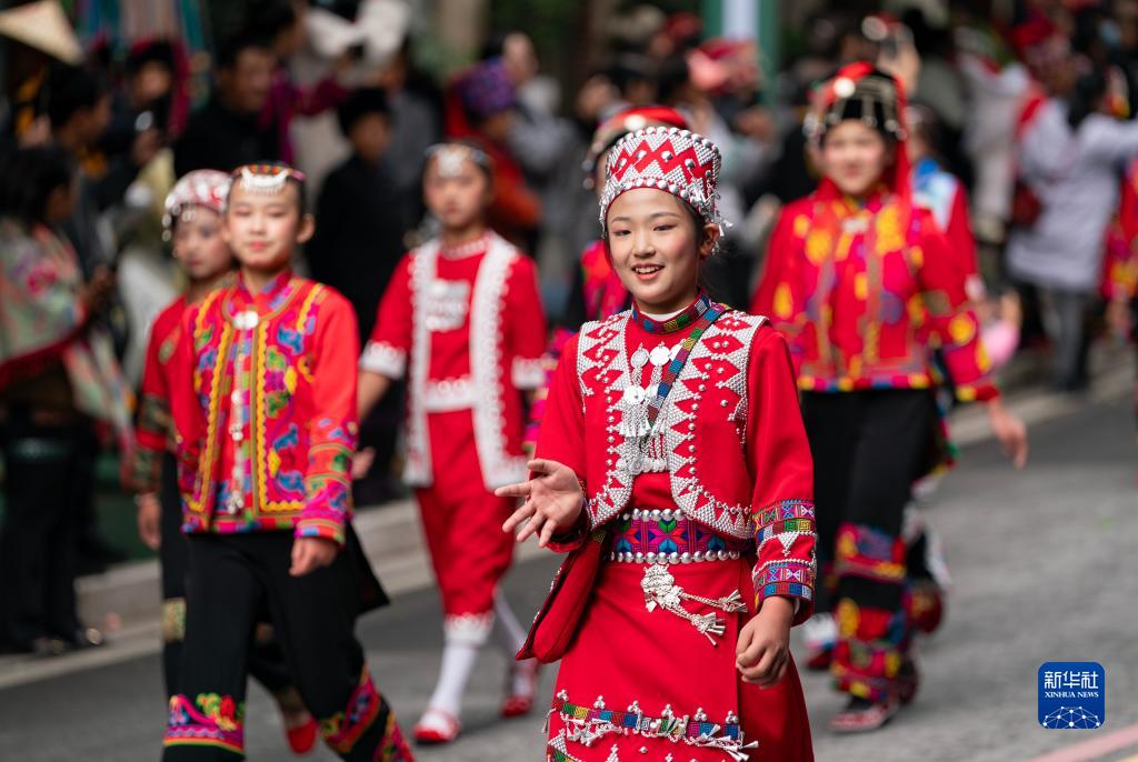 11月19日,綠春縣哈尼族群眾參加哈尼長(cháng)街古宴巡游展演。