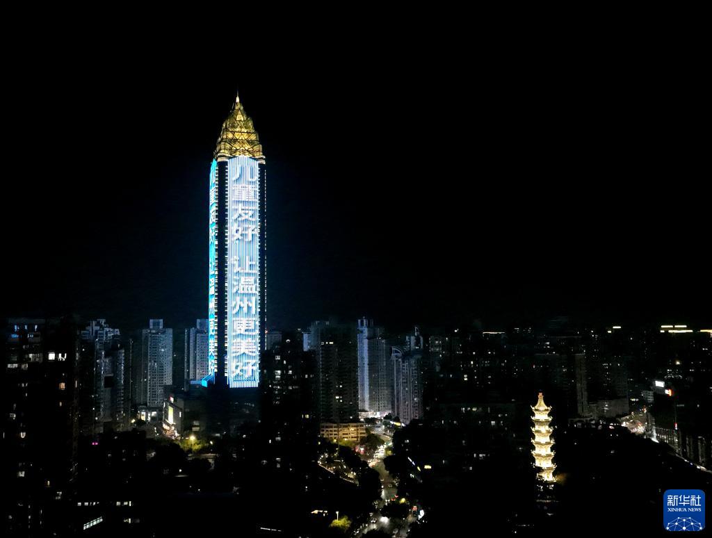 11月20日,浙江省溫州市地標性建筑世貿中心大廈為世界兒童日亮燈(無(wú)人機照片)。