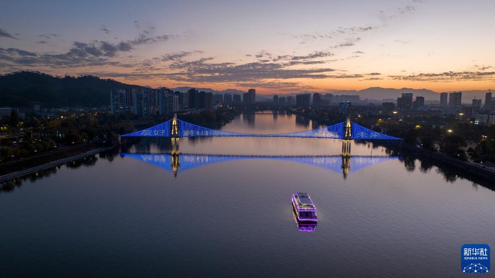 11月20日,安徽省黃山市屯溪區新安江觀(guān)光索橋為世界兒童日亮燈(無(wú)人機照片)。