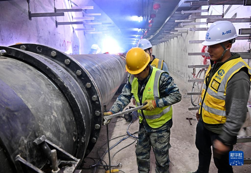 中鐵二局建設者在青島市唐河路——安順路打通工程(涉鐵段)綜合管廊內施工(11月20日攝)。