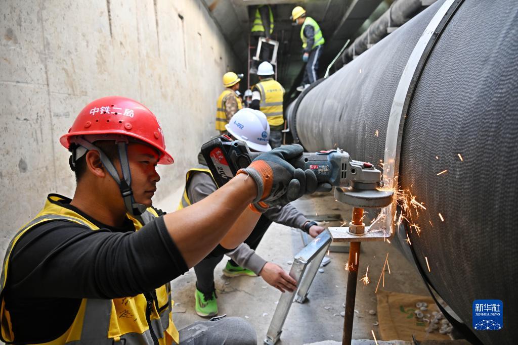 中鐵二局建設者在青島市唐河路——安順路打通工程(涉鐵段)綜合管廊內施工(11月20日攝)。