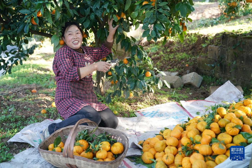 11月20日,旬陽(yáng)市呂河鎮冬青樹(shù)村村民在采收獅頭柑。