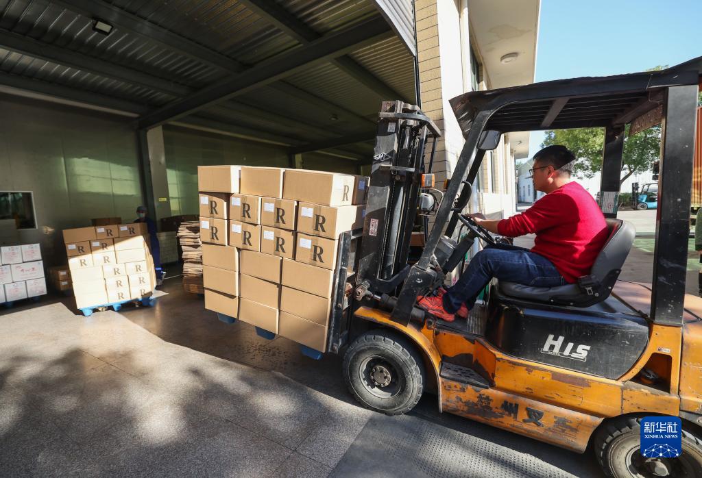 11月21日,在諸暨市店口鎮的一家炒貨企業(yè)內,工作人員把打包好的炒貨裝車(chē)。