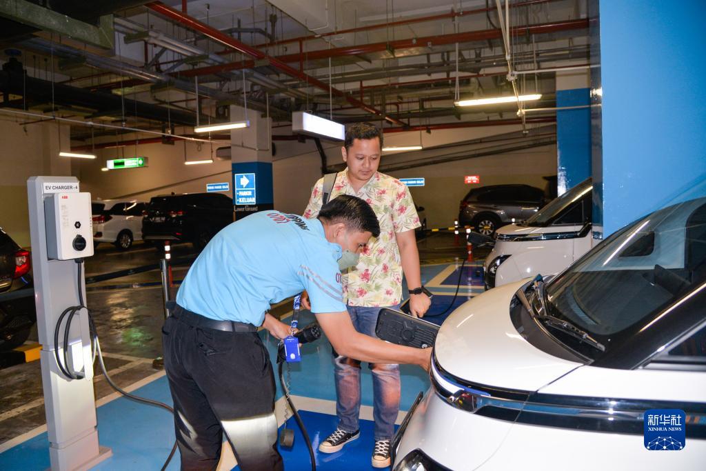 9月29日,在印度尼西亞雅加達一家商場(chǎng)的地下停車(chē)場(chǎng),工作人員為一位五菱新能源車(chē)Air ev車(chē)主結束充電。新華社記者 徐欽 攝