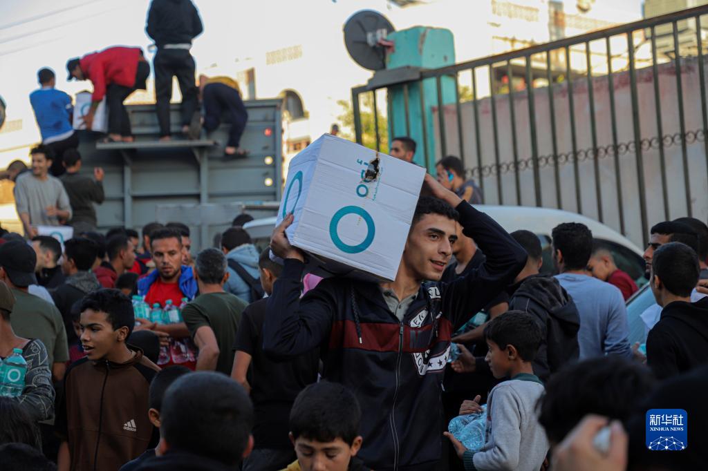 11月21日,在加沙地帶南部城市汗尤尼斯,民眾領(lǐng)取飲用水。