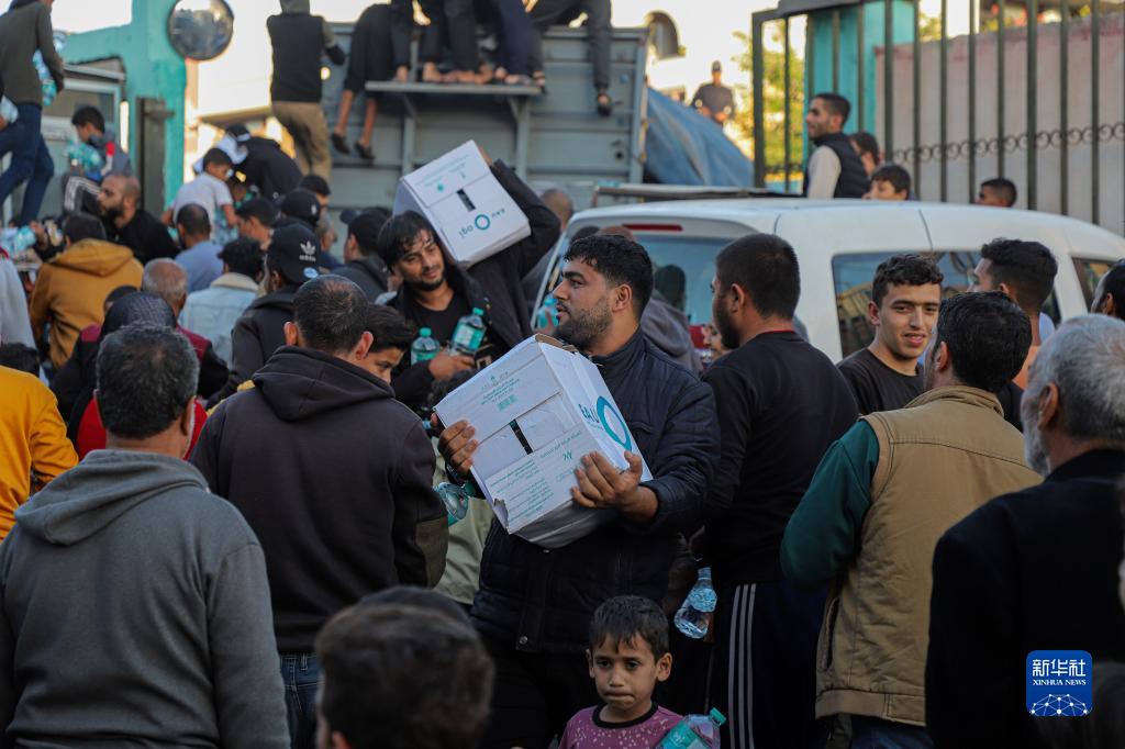 11月21日,在加沙地帶南部城市汗尤尼斯,民眾領(lǐng)取飲用水。