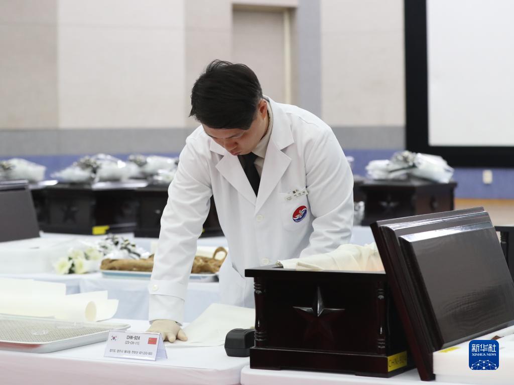 11月22日,在韓國仁川,韓方工作人員將志愿軍烈士遺骸入殮。