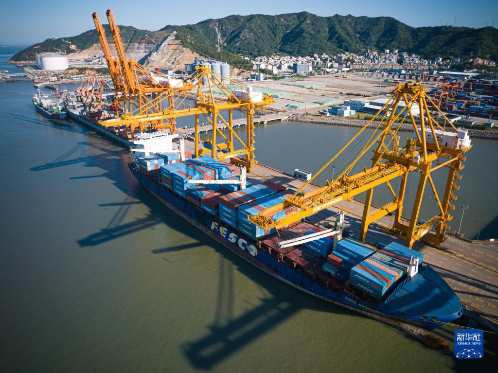 11月22日,貨輪??吭跍刂莞蹱钤b箱碼頭卸載集裝箱(無(wú)人機照片)。