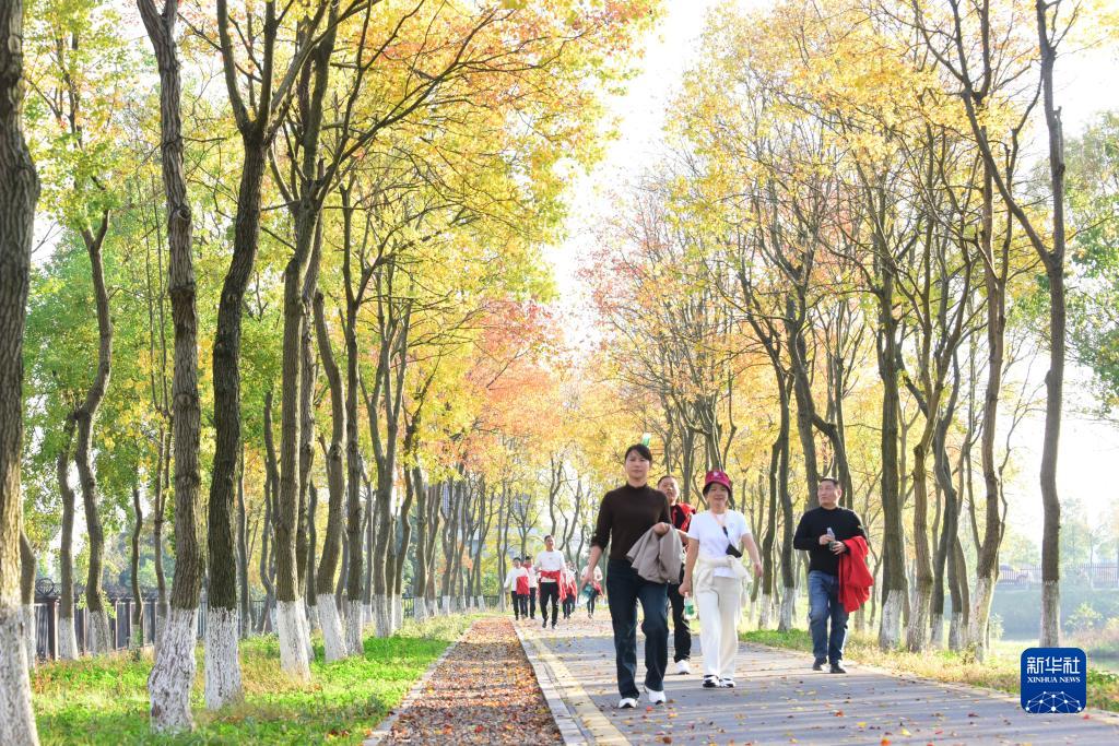 11月21日,游客在湖南省常德市澧縣城頭山國家考古遺址公園烏桕廊道里漫步。