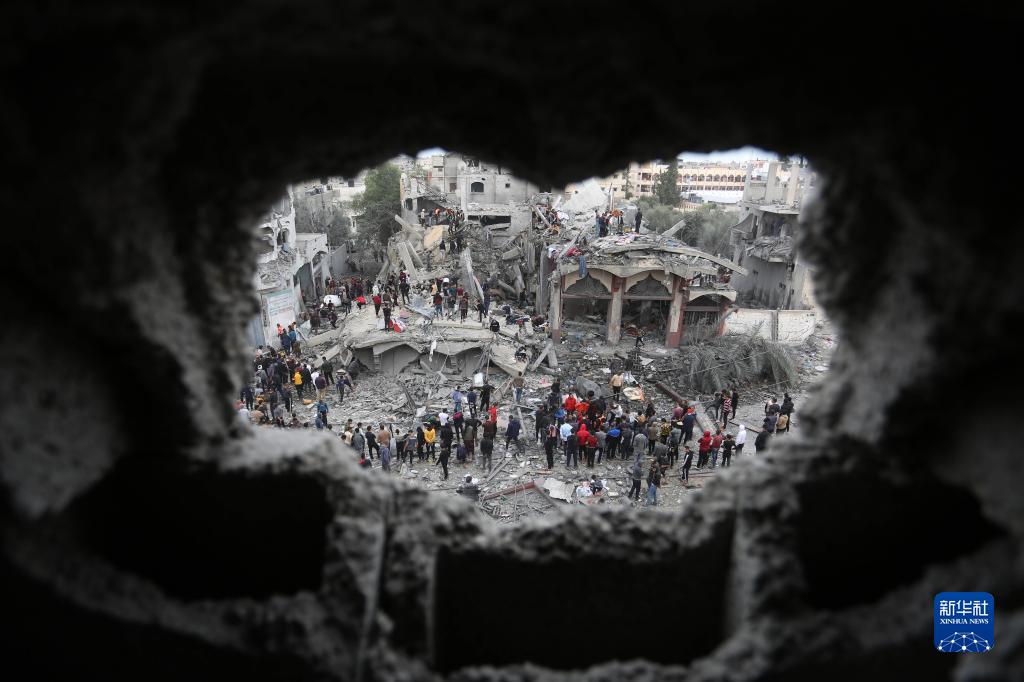 11月22日,人們在加沙地帶南部城市拉法的建筑廢墟上實(shí)施救援。